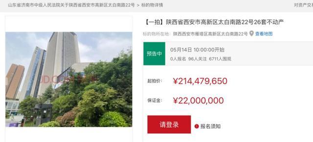 京东资产交易平台信息显示,2026年5月14日,山东省济南市中级人民法院将对西安建工资产管理运营集团有限公司(以下简称“西安建工”)名下26套不动产进行司法拍卖,评估价为3.06亿元,起拍价为2.14亿元,相当于评估价的七折。截至目前,共有6711人围观,零人报名。